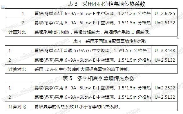 按以上方法,可計(jì)算出以下各種情況下幕墻傳熱系數(shù):