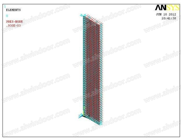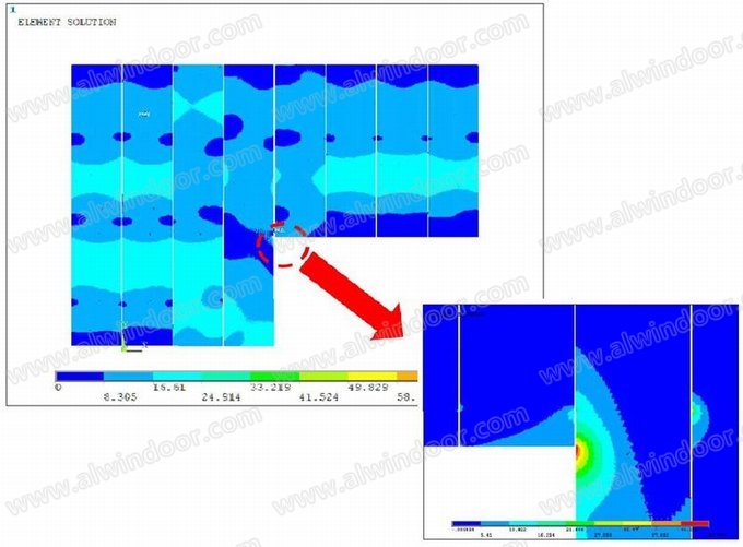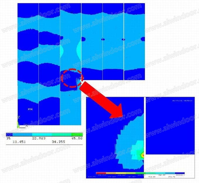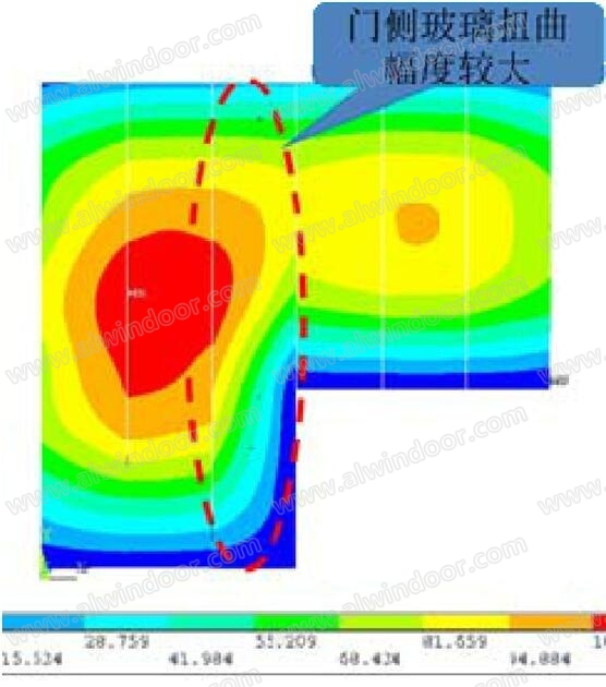 顯而易見,這種分析模型偏離實(shí)際情況太多,導(dǎo)致結(jié)果與實(shí)際嚴(yán)重不符,所得結(jié)果異常偏小。而且這種脫離實(shí)際的分析結(jié)果掩蓋了玻璃實(shí)際出現(xiàn)的較大撓度變形,在門邊口位置,因?yàn)闆]有改善措施而導(dǎo)致設(shè)計(jì)失敗