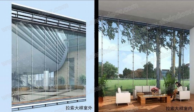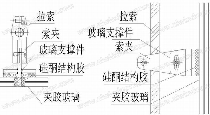 些特征(圖 6),其區(qū)別是支撐結(jié)構(gòu)的形式不同,由剛性玻璃肋換成柔性的拉索。
