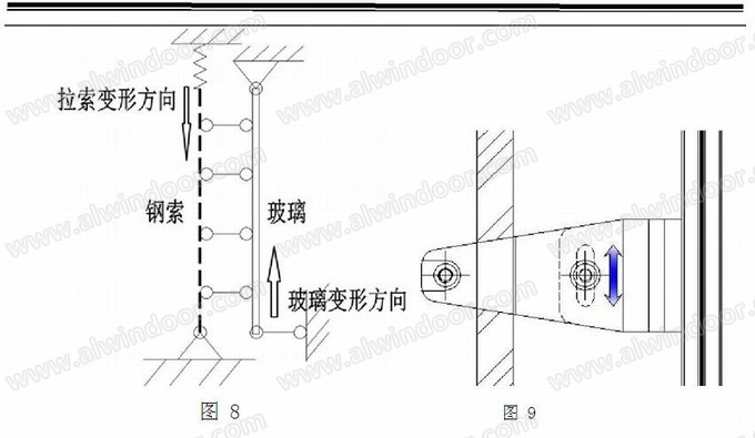 目前,國內(nèi)還沒有規(guī)范針對(duì)預(yù)應(yīng)力索網(wǎng)(單索)幕墻的設(shè)計(jì)規(guī)范,沒有撓度控制的相關(guān)規(guī)定(目前新版《玻璃幕墻工程技術(shù)規(guī)范(送審稿)》有建議不大于1/45L)。見于國內(nèi)外文獻(xiàn)中,關(guān)于拉索幕墻的結(jié)構(gòu)撓度限值一般為 1/30L~1/50L。究其原因是當(dāng)撓度控制要求小于 1/50L,索的計(jì)算軸拉力會(huì)成非線性的急劇增大,因而索體及支撐索體的主體結(jié)構(gòu)(詞條“主體結(jié)構(gòu)”由行業(yè)大百科提供)成本會(huì)急劇上升。在目前情況下,國內(nèi)單索工程常從嚴(yán)控制選取 1/50L 作為撓度限值。有前述分析可知,索結(jié)構(gòu)是玻璃的支撐結(jié)構(gòu),索與玻璃通過索夾和玻璃支撐件裝配在一起(圖 7)。這樣問題隨之而來,《玻璃幕墻工程技術(shù)規(guī)范 2003 版》中 6.1.3.3 條、7.2.3 條、8.1.5.3 條對(duì)各種形式的玻璃規(guī)定的撓度限制均為支撐間距的 1/60。(需要注意的是,對(duì)這些條文的規(guī)定直接套用在本案例中會(huì)導(dǎo)致錯(cuò)誤的結(jié)果,這些在后續(xù)章節(jié)會(huì)加以分析說明)即面板(詞條“面板”由行業(yè)大百科提供)與支撐結(jié)構(gòu)同步變形,但是支承結(jié)構(gòu)(詞條“支承結(jié)構(gòu)”由行業(yè)大百科提供)的撓度控制要求卻低于面板。