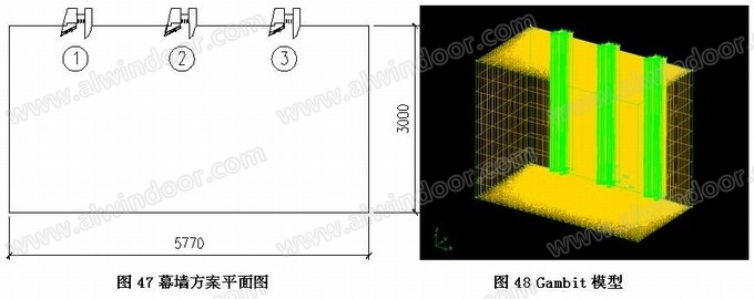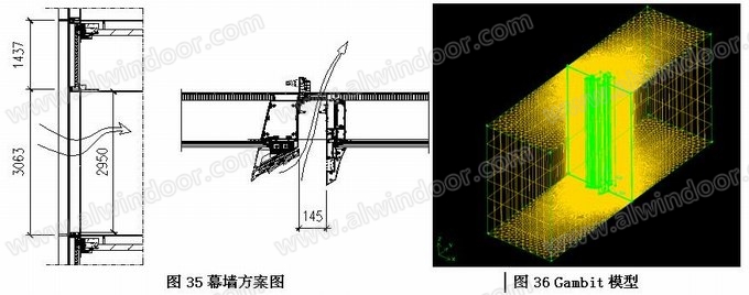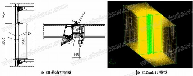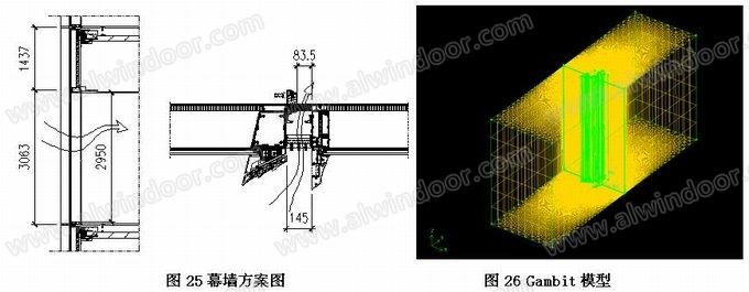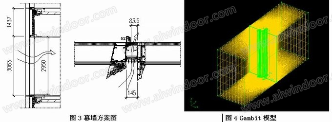 選取幕墻一個通風單元作為分析對象,橫向左右玻璃寬度取700mm,豎向取一個樓層透光高度2950mm。開啟門完全開啟狀態(tài),室外空氣流速假設為2.2m/s,室外溫度取16度,室內(nèi)溫度取26度。