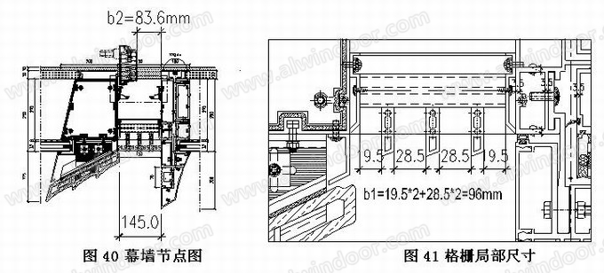 幕墻通風主要依靠開啟門的開啟與關閉進行控制。開啟門開啟寬度的大小與開啟門外側(cè)的鋁格柵條間距大小都會直接影響到幕墻的通風量。格柵總開口寬度為150mm,高度為2950mm。豎向格柵條間距為28.5mm,水平方向加設三根鋁型材(詞條“型材”由行業(yè)大百科提供)副框。
