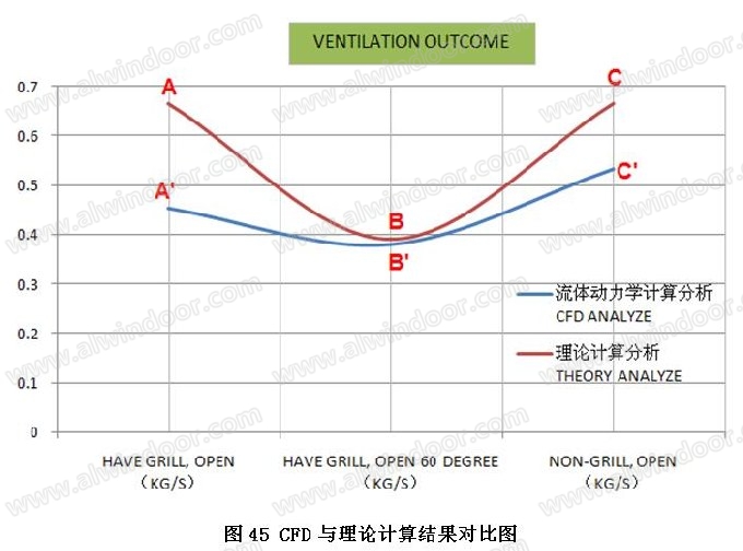 在AB~A’B’區(qū)段,幕墻設置有格柵,從完全開啟狀態(tài)到60度開啟狀態(tài)范圍。經(jīng)過格柵及開啟門的空氣流動路徑受到鋁型材及膠條等幕墻構件的影響而發(fā)生改變,空氣的流動能量有所損耗。實際計算出來的通風量約為理論計算結果的68%。