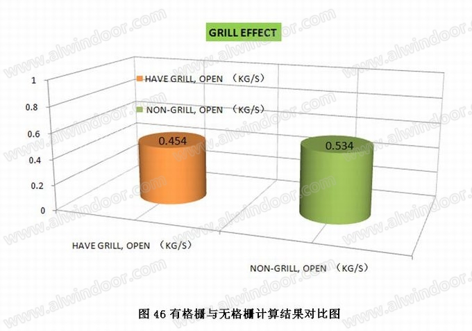 由上表可知,開啟門在完全開啟狀態(tài)下,設置格柵后的幕墻通風量約為沒有設置格柵的幕墻通風量的85%。
