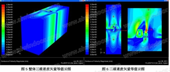 模型長約6米,寬約1.6米,高約2.95米,此尺寸三維空間模型可認為滿足本文流體動力學模擬計算的需要。輻射(詞條“輻射”由行業(yè)大百科提供)強度經(jīng)FLUENT軟件自動計算,模擬結果如下:從下圖速度矢量等值3D云圖可知,以開啟門位置為基線,空氣以W字形向兩側(cè)展開擾動,靠近開啟門的空氣湍流最為劇烈,距離開啟門約900mm位置的空氣擾動逐步增強,有著明顯的波形擾動范圍。再對速度矢量等值2D切片云圖的A、B、C、D、E、F六個速度矢量點進行詳細分析: