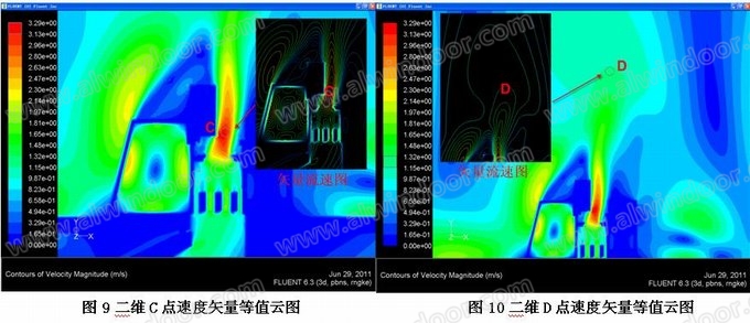 D點:室內(nèi)區(qū)域距離開啟門約650mm區(qū)域,空氣流速約為2.2m/S。此區(qū)域范圍內(nèi)空氣流速較大,辦公設施(如打印機等)應避免在此區(qū)域內(nèi)布置。