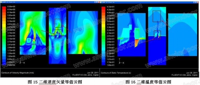 假設開啟門完全關閉狀態(tài),太陽輻射強度經(jīng)FLUENT軟件自動計算。從下圖可知,幕墻面兩側(cè)的溫度分布較為均勻。由于中空玻璃的LOW-E膜反射了絕大部分紅外輻射,從而減少了吸收和再次輻射,故室外幕墻玻璃面溫度處于50~60度的范圍。另外由于受室外空氣的擾動及對流作用,靠近室外玻璃面的空氣溫度也比室內(nèi)空氣的溫度要高。