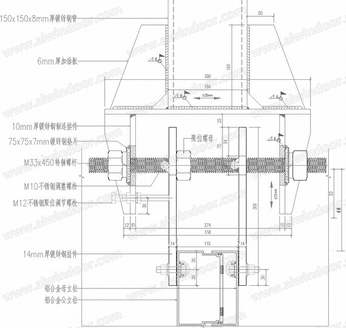 (2)鋼支座連接板與用作掛軸的不銹鋼(詞條“不銹鋼”由行業大百科提供)螺桿的連接處,設有水平方向長圓孔,以此可調整不銹鋼螺桿掛軸的進出位置,進而消除土建結構在進出位的誤差;