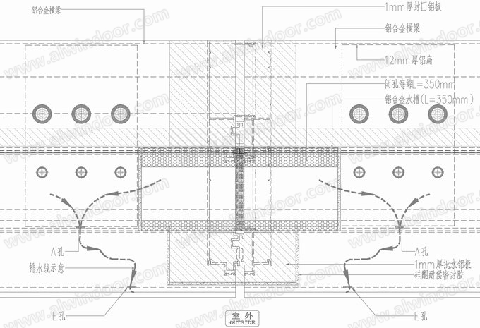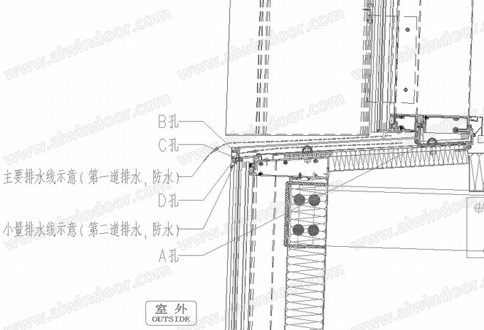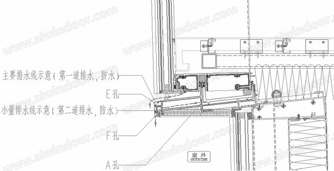 進入第二道等壓腔的水通過單元上橫梁調節槽的A孔進入前端排水腔,然后順著橫梁前端排水腔先后通過B孔、C孔、D孔(內傾退臺)或E孔、F孔(外傾凸臺)排到室外。(如圖2.16~2.18)