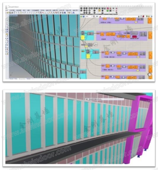 M2南北面的錯位雙曲面幕墻,通過建筑造型分析,幕墻中每個分格的立柱(詞條“立柱”由行業大百科提供)傾斜角度不一樣,且弧形退臺(凸臺)的尺寸從中間向兩邊逐漸減小,同時還需配合立面不同高度的裝飾線條,若采用傳統的CAD建模模擬,將耗費大量的人力且不便于模型的檢查校核,因此,本項目的錯位雙曲面幕墻采用BIM技術--犀牛+Grasshopper參數化技術進行應用。