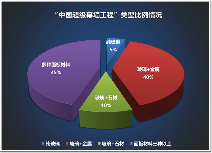 透過幕墻類型的使用比例,從中不難看出在建筑造型設計中,玻璃幕墻的應用依然是設計師及業主的首選項,尤其是建筑功能使用偏公用型的設計中,往往要考慮與周圍環境的融合與內部配合,內部采光、視野等,石材幕墻、金屬板幕墻等大多在設計建筑造型、外立面包邊等處采用較多。新型幕墻面板材料主要滿足設計及應用的創新性,隨著近年不斷在具體應用案例中得到支撐,因此也越來越受到業主的關注,精品迭出。