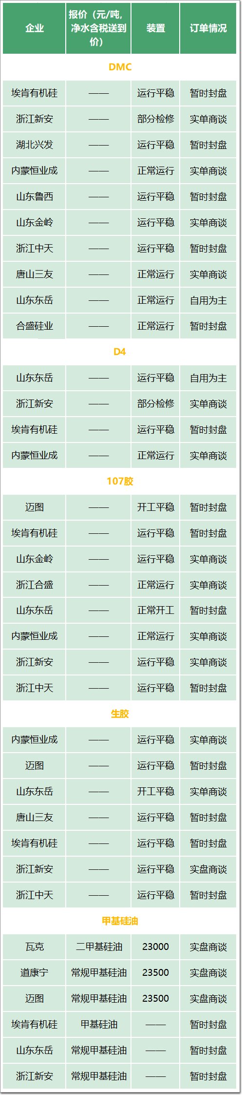 國(guó)外由于疫情原因有機(jī)硅開(kāi)工率低,訂單轉(zhuǎn)移至中國(guó)市場(chǎng),單體廠家外銷(xiāo)量減少,企業(yè)限量接單,下游廠家因原料不斷上漲,紛紛上調(diào)價(jià)格。上周末有機(jī)硅廠家多封盤(pán)不報(bào),預(yù)計(jì)價(jià)格將會(huì)持續(xù)上漲。