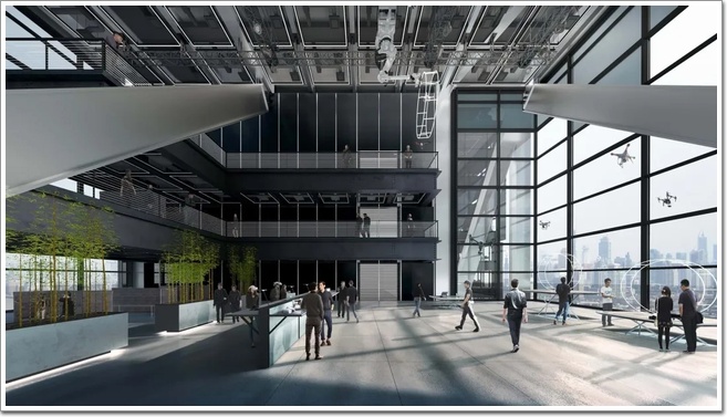 而內(nèi)部,這座建筑推翻了辦公空間的傳統(tǒng)理念,在空中構(gòu)建出一個全新的創(chuàng)意社區(qū),除了壯觀的玻璃廊橋、令人印象深刻的大而無柱的內(nèi)部空間,還包括四倍高度的無人機飛行測試實驗室。