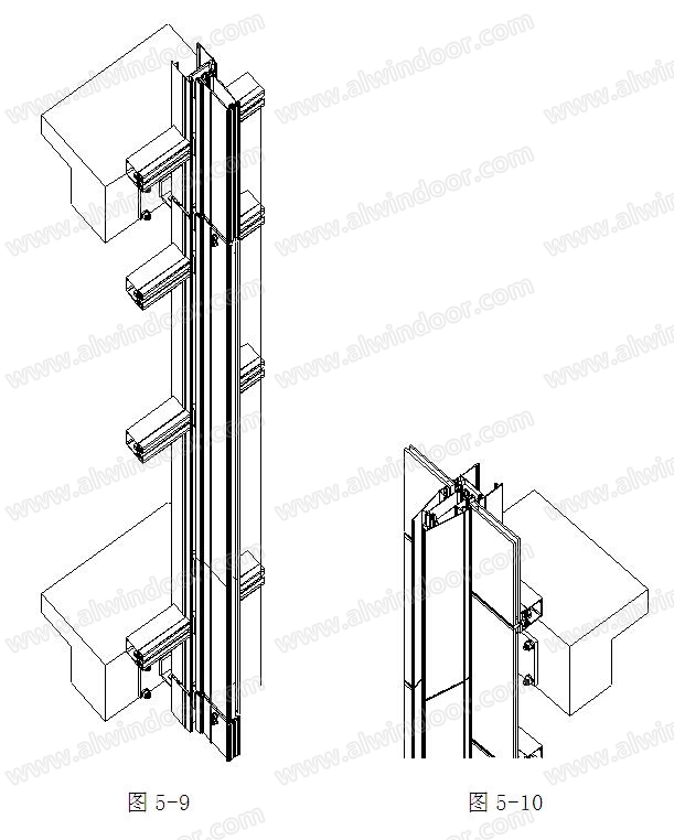 圖5-9為大裝飾帶構件式斷熱玻璃幕墻立柱在建筑體上的安裝示意圖;