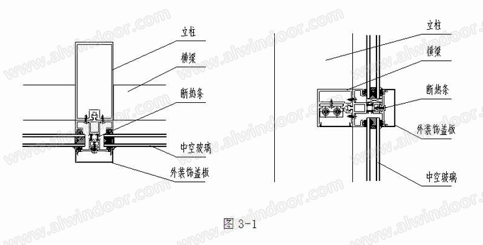 一種是單元式斷熱玻璃幕墻,如圖3-3所示,該斷熱玻璃幕墻立柱為組合型立柱,即采用斷熱條與鋁型材組合的方式,主承力桿件為立柱靠近室內的鋁合金部分。