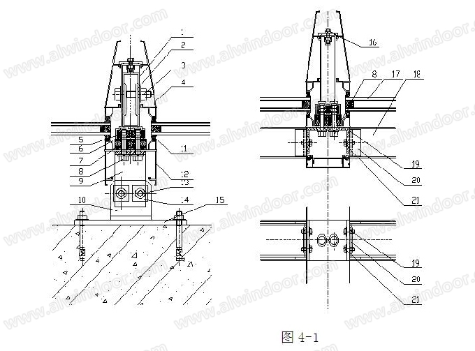 立柱(1)與內槽座(12)、外聯結角鋼(9)或槽鋼連接件(19)之間的聯接采用了兩個螺栓(8)。即可以限制立柱(1)的扭擰作用,同時足以承擔風力荷載、地震荷載及自重荷載;