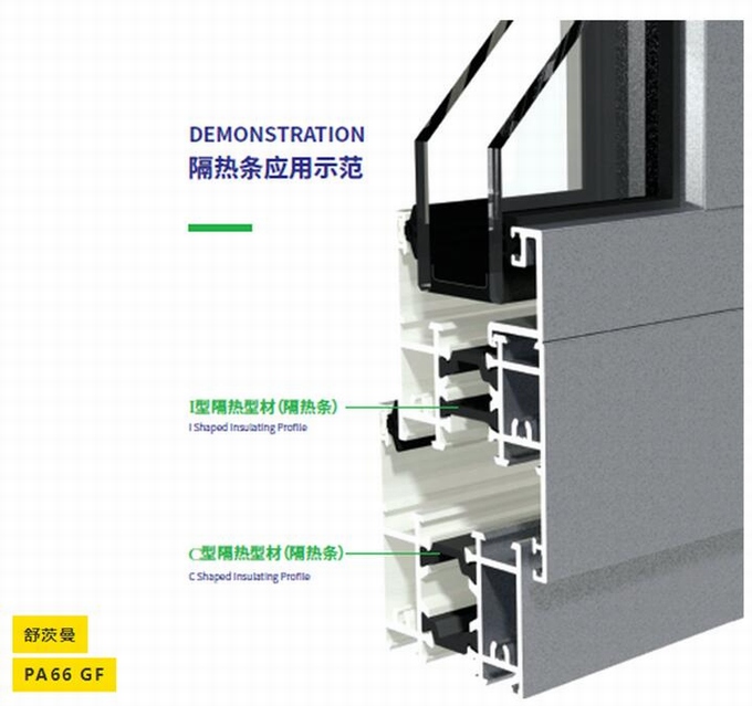 舒茨曼PA66(詞條“PA66”由行業大百科提供) GF隔熱型材(隔熱條),因超低的熱導率(詞條“熱導率”由行業大百科提供) (λ< 0.3 W/(mK)) ,可以實現優異的框架或復合材料 Uf值,減少熱量損耗,節約能源。
