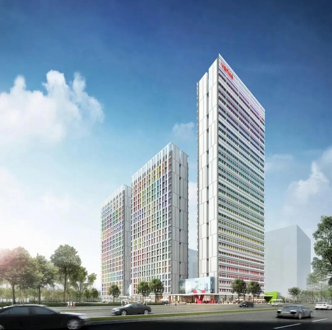 該建筑采用彩色單元化立面,彩色涂料結合穿孔金屬(詞條“金屬”由行業大百科提供)板,使用豐富的色彩給人帶來的感官上活潑感,也能很好地對應項目年輕態的定位。