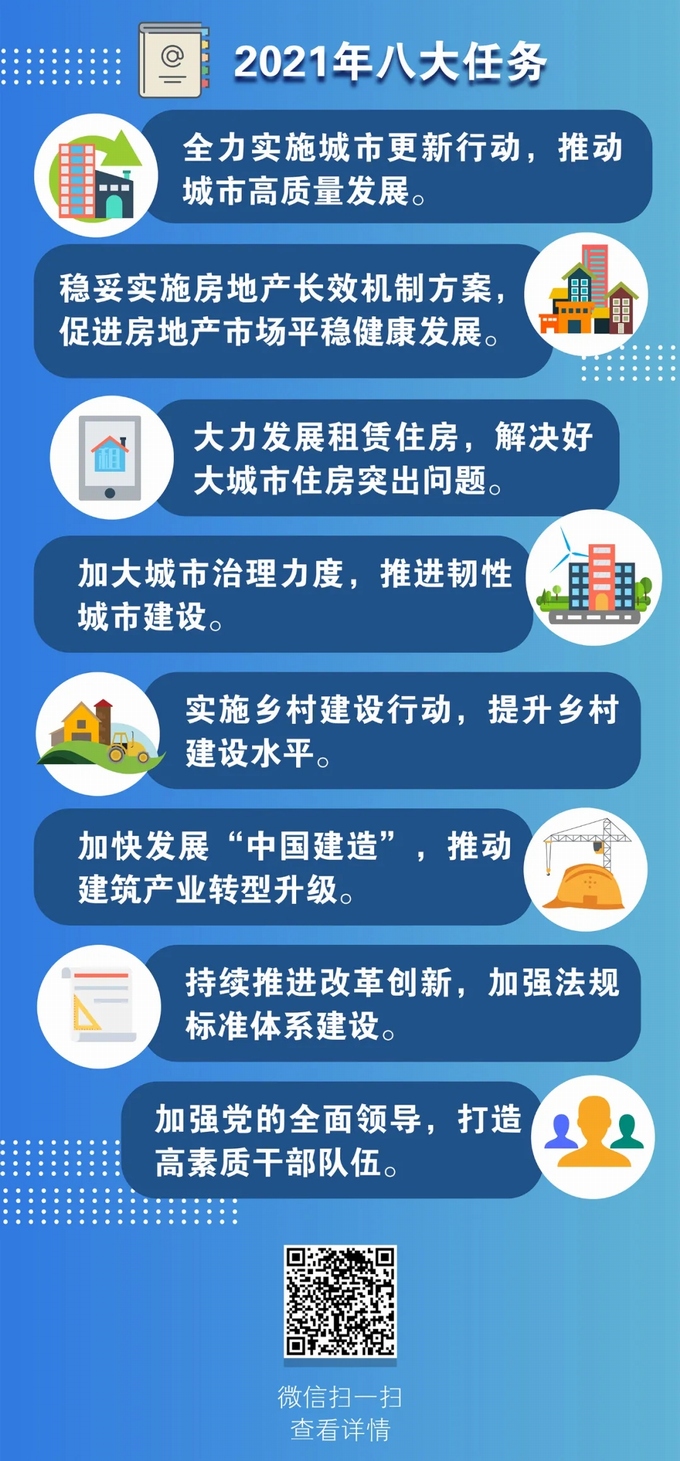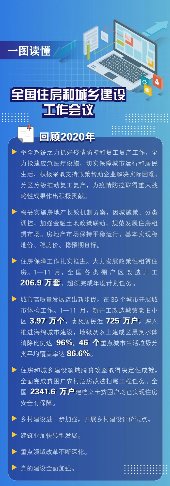 會議要求,2021年要持續深入學習貫徹習近平總書記關于住房和城鄉建設工作的重要指示批示精神,貫徹落實黨的十九屆五中全會和中央經濟工作會議決策部署,重點抓好八個方面工作。