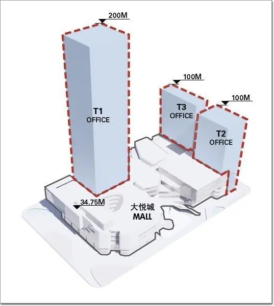 其次,地標塔樓與大悅城商場緊密相連,塔樓造型需要和5層高商業體量相互協調,形成和諧的整體建筑形象。