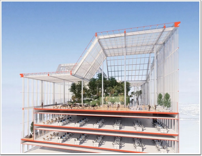 塔樓利用中低區避難層和屋面,分別對應三組電梯分區,提供了三個室外和半室外的休憩空間。在這些挑高空間中,可以觀景、漫步、社交,為都市格子間人群提供了一個透氣的“第三空間”。同時,外立面的豎向遮陽(詞條“遮陽”由行業大百科提供)構件,既可遮擋三亞夏季下午的強烈日照,又會讓冬日陽光直入樓層深處;在遮陽構件背后巧妙布置的通風裝置,可以有效改善室內的微氣候。