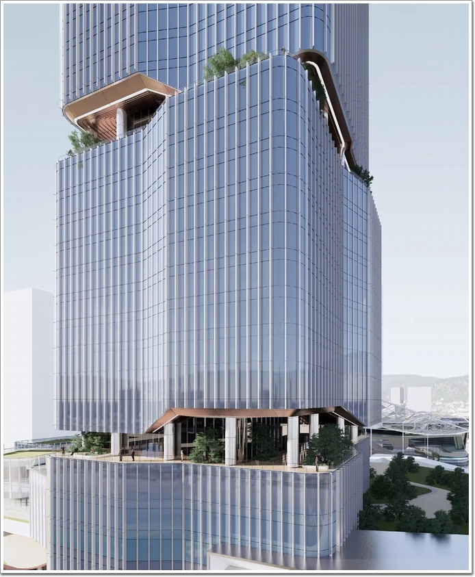 微弧的三亞灣和從海灘逐漸隆起、連綿不絕的丘陵與群山,塑造了三亞市極具特色的地方景觀。基地西面朝向海灣,距離海灘僅3公里,基地東、南、北三側為山脈環繞,緊鄰基地北側還有一處城區面積最大的東岸濕地公園。為了響應基地極佳的景觀資源和鮮明的地理特征,塔樓標準層在外輪廓的四邊微折,轉角無柱加弧形倒角的處理,以增加樓層景觀界面和最大化360度觀景視線;塔冠部分結合立面折疊進退,以高低錯落的動感造型進一步呼應三亞市“山海相連”的地域特征。同時,利用低中區的避難層,打造了兩個半室外架空層,在架空層上下,外輪廓折面左右鏡像,使得塔樓整體塑形更為豐富有機。兩個具有深重陰影的架空層,也正好是三亞熱帶海洋性氣候的外在表達。