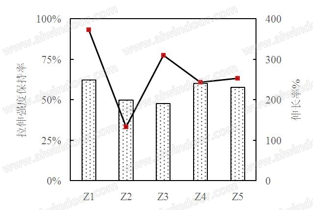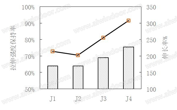 由圖3 可見,丙烯基三乙氧基硅烷交聯劑具有最大的拉伸強度保持率和拉伸伸長率。交聯劑的側鏈基團越大丙基>乙烯基>甲基,越有利于水汽小分子的進出,拉伸強度保持率增大,斷裂伸長率增大。