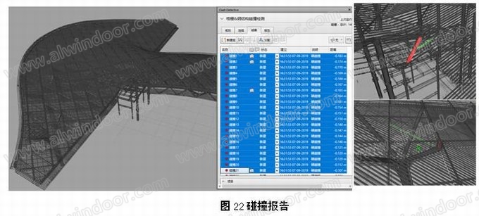 將各專業模型匯總、整合,將幕墻模型與相關專業模型進行碰撞檢測,檢查是否存在出現沖突的情況出現,形成可視化檢測報告。本項目已通過多專業協調檢測模型,發現數十個沖突,將問題在正式施工前得以解決,避免材料浪費及工期延誤。