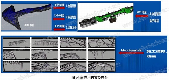 根據幕墻類型選用使用BIM軟件,本項目屋面幕墻系統全部構建采用Rhino軟件,結合GH輔助完成建模、提料、工藝制作;玻璃盒子造型比較規整則采用Revit軟件;施工模擬、動畫、碰撞采用Navisworks軟件。