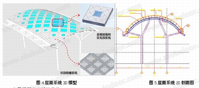 屋面幕墻整體造型為長條弧形,短軸為近似圓形,長軸為波浪弧形,造型比較復雜,設計難度和工作量非常大。屋面幕墻系統分為金屬屋面和采光頂系統、吊頂格柵系統。本系統使用RHINO+GH建模,將鋁面板、玻璃面板、鋼件主龍骨(詞條“主龍骨”由行業大百科提供)、鋁合金(詞條“鋁合金”由行業大百科提供)次龍骨、吊頂格柵&骨架、鋼支座詳細建模,深度達到LOD400。