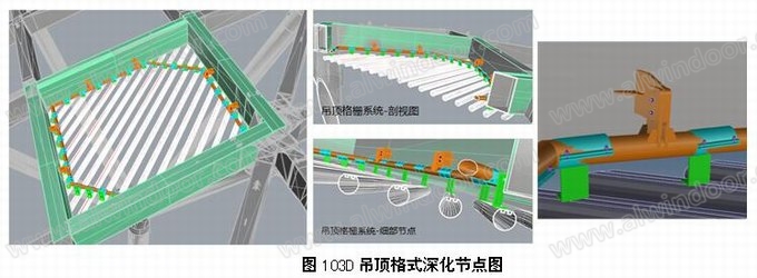 吊頂格柵系統為鋁合金圓管,采用框架式單元板塊設計,即在工廠完成單元板塊組裝后運至現場實施整體吊裝,板塊通過多維調節支座與主體結構連接,因本項目設計是將格柵連接件設在主體鋼結構內側,因此,準確的BIM模型是保證加工質量的前提。本次也是將格柵系統進行了詳細建模,并與主體結構進行合模,以確保各構件與主體之間的良好配合。
