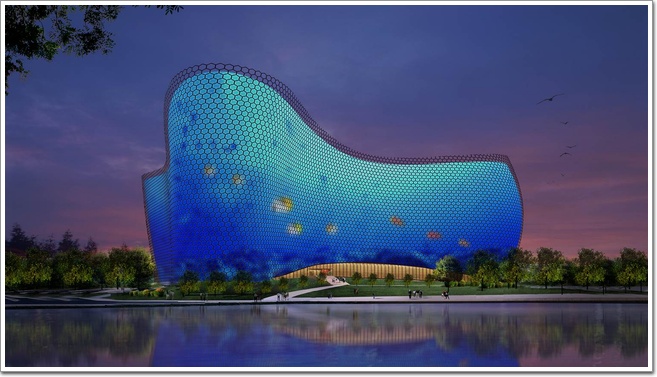 本項目最為特別之處莫過于白色巨網構成的建筑表皮和充滿動感的曲線輪廓,尤其在夜間更是使人產生無盡的遐想,普陀大劇院是夜間的精靈,日間樸實的外表在夜間卻大放光彩,建筑以光為筆,將大劇院外立面變成巨大的畫布,通過具有象征意義的元素將普陀的文化、地域特色進行形象化、符號化的表達:海浪、水波、魚群等元素完美、柔和地展現出海洋文化的精髓,蓮花元素代表著普陀的佛教文化,四季、水墨等元素則體現的是普陀的自然風光,展現出普陀的地理位置所蘊含的獨特氣質。