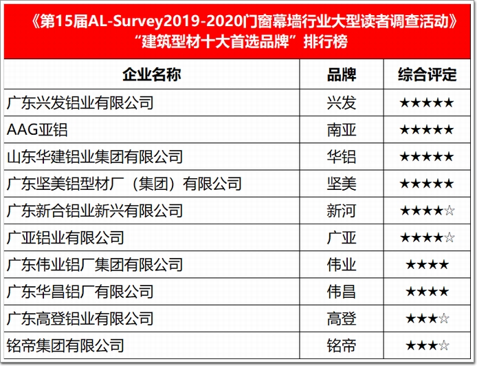 親眼見證、共同成長(zhǎng)|2005——2020,十五載傾情演繹!十五載不忘初心!用實(shí)力說話、見證建筑門窗幕墻行業(yè)品牌力量!打造全產(chǎn)業(yè)鏈體系,為高質(zhì)量發(fā)展賦能!堅(jiān)持綠色環(huán)保、可持續(xù)發(fā)展,堅(jiān)持工匠精神,遴選出最優(yōu)秀的行業(yè)品牌企業(yè),成就行業(yè)真正的“TOP10”,堅(jiān)持走品牌化之路的企業(yè),由中國建筑金屬結(jié)構(gòu)協(xié)會(huì)主辦,中國幕墻網(wǎng)承辦的“2019-2020年度第十五屆AL-Survey門窗幕墻行業(yè)年度大型讀者調(diào)查暨‘我最喜愛幕墻工程’評(píng)選活動(dòng)”(以下簡(jiǎn)稱“AL-Survey”)為您推送!