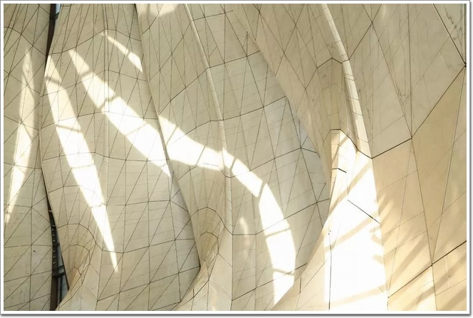 九片「花瓣」的外層由硼硅酸鹽玻璃板構成,內層則是使用了來自于葡萄牙的大理石。說起來輕巧,但在當時建筑師和工匠一起進行了四年的實驗才得以成功。