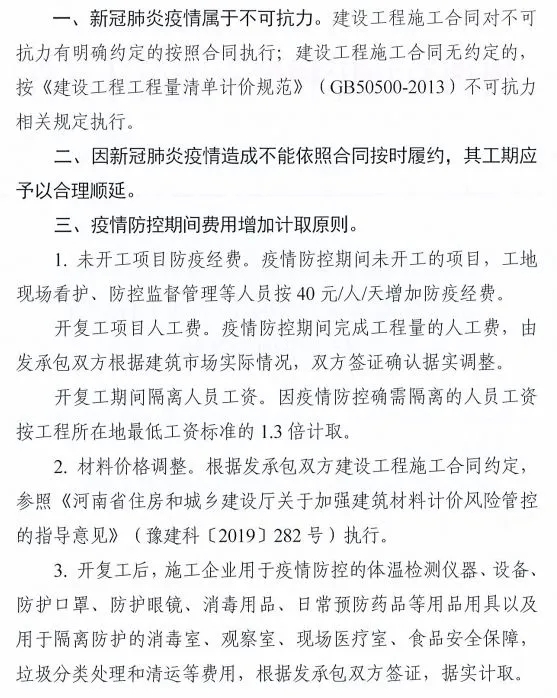 (三)疫情防控期間未復工的項目,合同價格調整按照法律法規及合同條款,參照不可抗力有關規定及約定合理分擔損失。