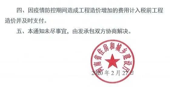 (四)疫情防控期間開復工的,必須嚴格落實防疫措施,保證人員安全,防止疫情傳播。因此導致的費用變化,發承包雙方應根據合同約定及下列規定,本著實事求是、風險共擔的原則協商調整工程造價:
