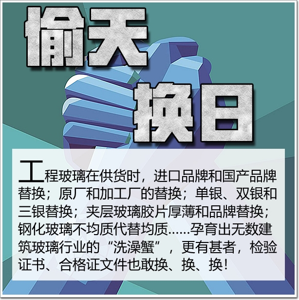 工程玻璃在供貨時,進口品牌和國產品牌替換;原廠和加工廠的替換;單銀、雙銀和三銀替換;夾層玻璃膠片厚薄和品牌替換;鋼化玻璃(詞條“鋼化玻璃”由行業大百科提供)不均質代替均質……孕育出無數建筑玻璃行業的“洗澡蟹”,更有甚者,檢驗證書、合格證文件也敢換、換、換!