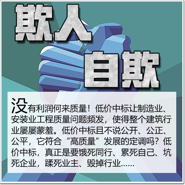 沒有利潤何來質量!低價中標讓制造業、安裝業工程質量問題頻發,使得整個建筑行業屢屢蒙羞,我們如何走出國門。低價中標且不說公開、公正、公平,它符合“高質量”發展的定調嗎?低價中標,低開高走,真正是要餓死同行、累死自己、坑死企業,蹂死業主、毀掉行業……