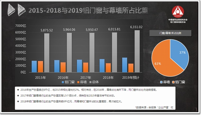 2019年整個鋁門窗幕墻行業的生產總值約在6300-6400億之間,相較2017年的生產總值約為5900多億,2018年總體產值6100多億均有小幅提升;同時,在2019年的行業總產值中,幕墻和鋁門窗占比的變化明顯,由以前的各占比一半,變化為了鋁門窗產值較為突出。
