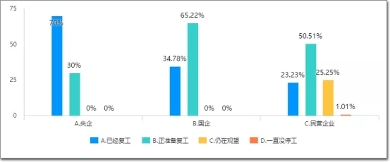 其中,央企已經復工高達70%,國企和民營企業多處于正在準備復工的狀態。