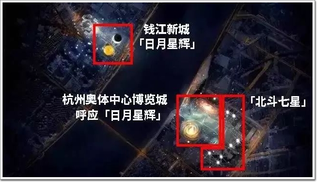 按照官方的說辭,該項目整體規(guī)劃采用了中國傳統(tǒng)的「北斗七星」意向,與隔著錢塘江的錢江新城「日月同輝」意向交相輝映。