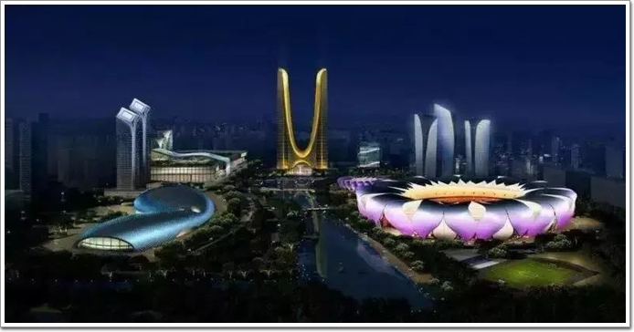 除了「小蓮花」網(wǎng)球中心,這里還建造了幾座超有噱頭的建筑:八萬人的「大蓮花」主體育場、「翅膀」游泳館、「倒立褲衩」雙塔和「禮器玉琮」綜合訓(xùn)練館。