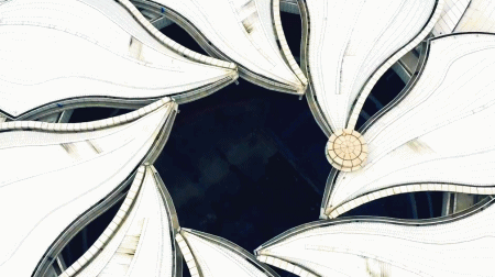 建筑最出彩的地方,是它世界首創(chuàng)「旋轉(zhuǎn)開閉屋蓋」的原理。建筑結(jié)構(gòu)采取桁架鋼結(jié)構(gòu),讓每片花瓣在視覺上構(gòu)成了相對獨立的效果,但實際上卻實為一個整體。