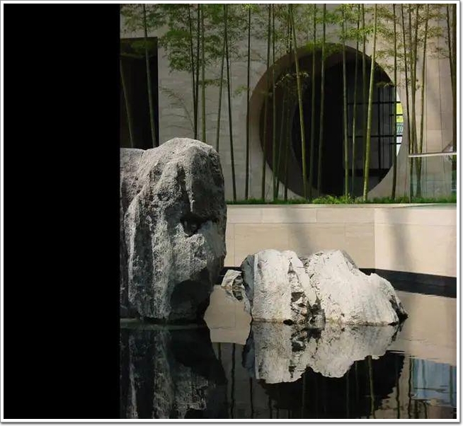 大廳主體色調為黃褐色,穩重的色彩與從屋頂的玻璃天窗泄入的日光相得益彰,柔和中帶有潤意,而大廳內布置的石與竹無疑就是為其增添了靈與氣。在厚重的軀殼之中挖出一個中庭,沒有費力的鑿池堆山,靠一兩個元素造活了中式園林,從而擁有了古典的內核。