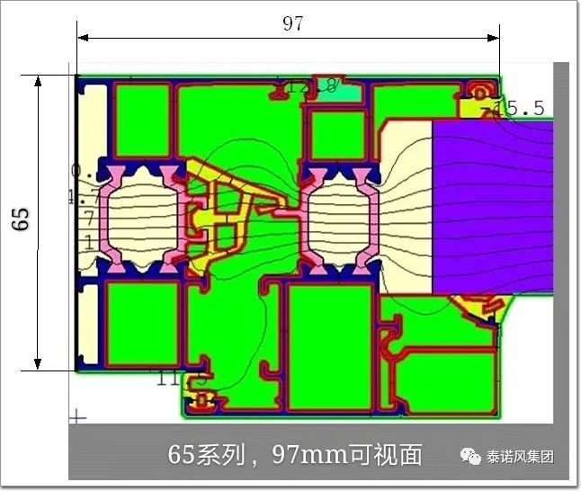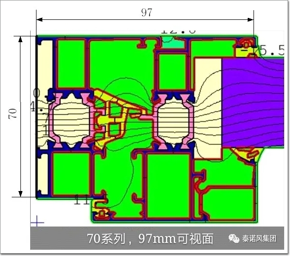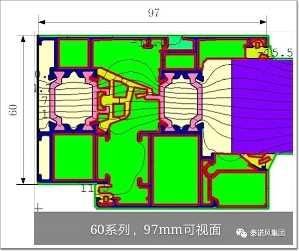 當可視面寬度為97mm時,60系列的Uf值為2.25W/m²K, 65系列的Uf值為2.28W/m²K, 70系列的Uf值為2.31W/m²K。