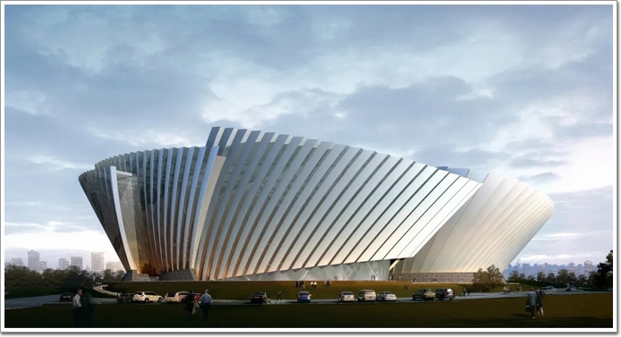 呼和浩特市新地標建筑,外形以“旭日騰飛”為創意,造型寓意馬鞍、哈達、沙丘等地域特色和內涵,整體造型以旭日東升為基底,賦以草原升起不落的太陽的視覺憧憬。屋面采用獨特的雙曲面空間管桁架結構,最大懸挑長度達39.2m,屬于目前國內設計最復雜、施工難度最大的鋼結構工程之一。