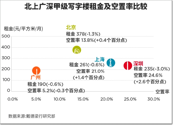 戴德梁行數(shù)據(jù)顯示,一季度深圳寫(xiě)字樓空置率24.6%,環(huán)比上升2.6個(gè)百分點(diǎn),居四大一線城市之首,同期上海空置率21%,北京13.8%,廣州5.2%。