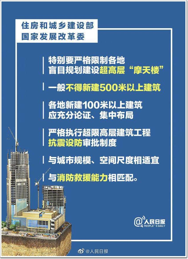 嚴格限制各地盲目規劃建設超高層“摩天樓”,一般不得新建500米以上建筑,嚴格限制新建250米以上建筑。