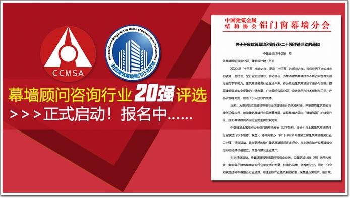 中國建筑金屬結構協會鋁門窗幕墻分會(以下簡稱:分會)與全國建筑幕墻顧問行業聯盟(以下簡稱:聯盟),將共同舉辦“2019-2020年度第二屆建筑幕墻咨詢行業二十強”評選活動,旨在更好的推廣建筑幕墻顧問咨詢行業,與上游房地產業及建筑業之間的品牌價值建立,信息傳播及企業推廣。