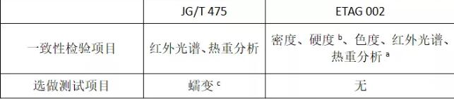 01、對于部分用于產品一致性鑒定的測試項目的設立上,ETAG-002項目更全,要求更細致,比如對于密度、硬度、顏色、紅外光譜、熱重分析均作為產品一致性鑒定的測試項目,而國內的JG/T 475僅以紅外光譜和熱重分析作為產品一致性要求的鑒定測試項目;